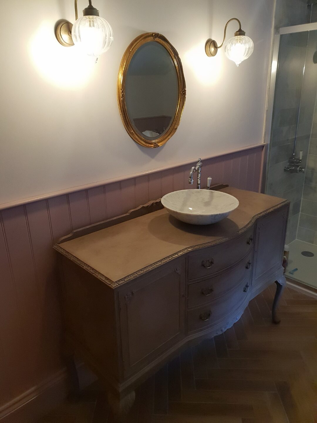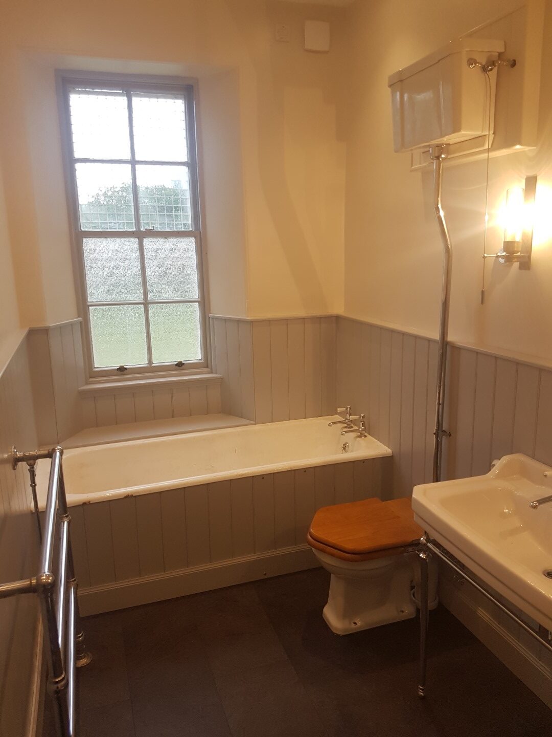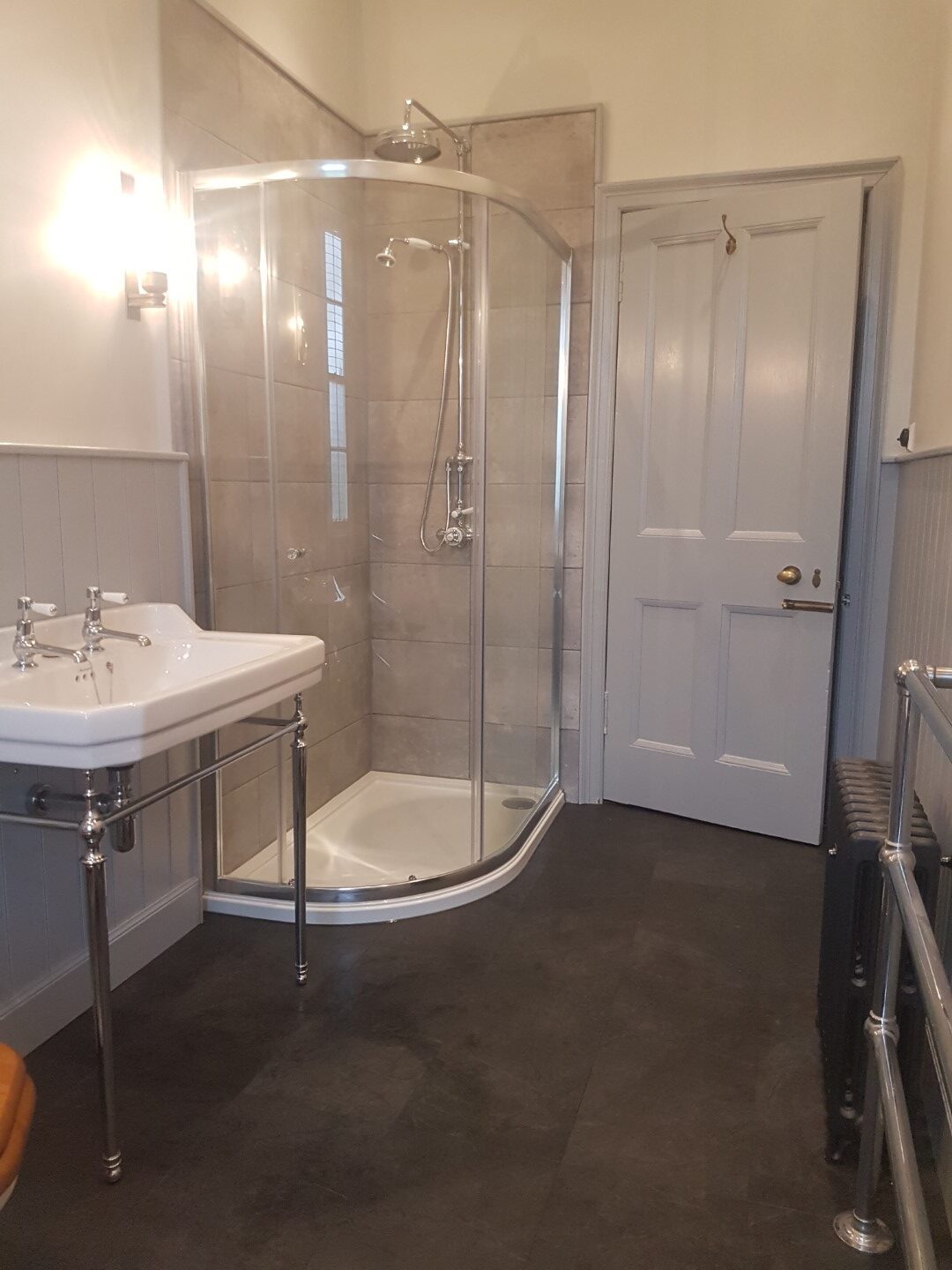 Bathroom design and build including new custom bead and butt timber panelling to walls