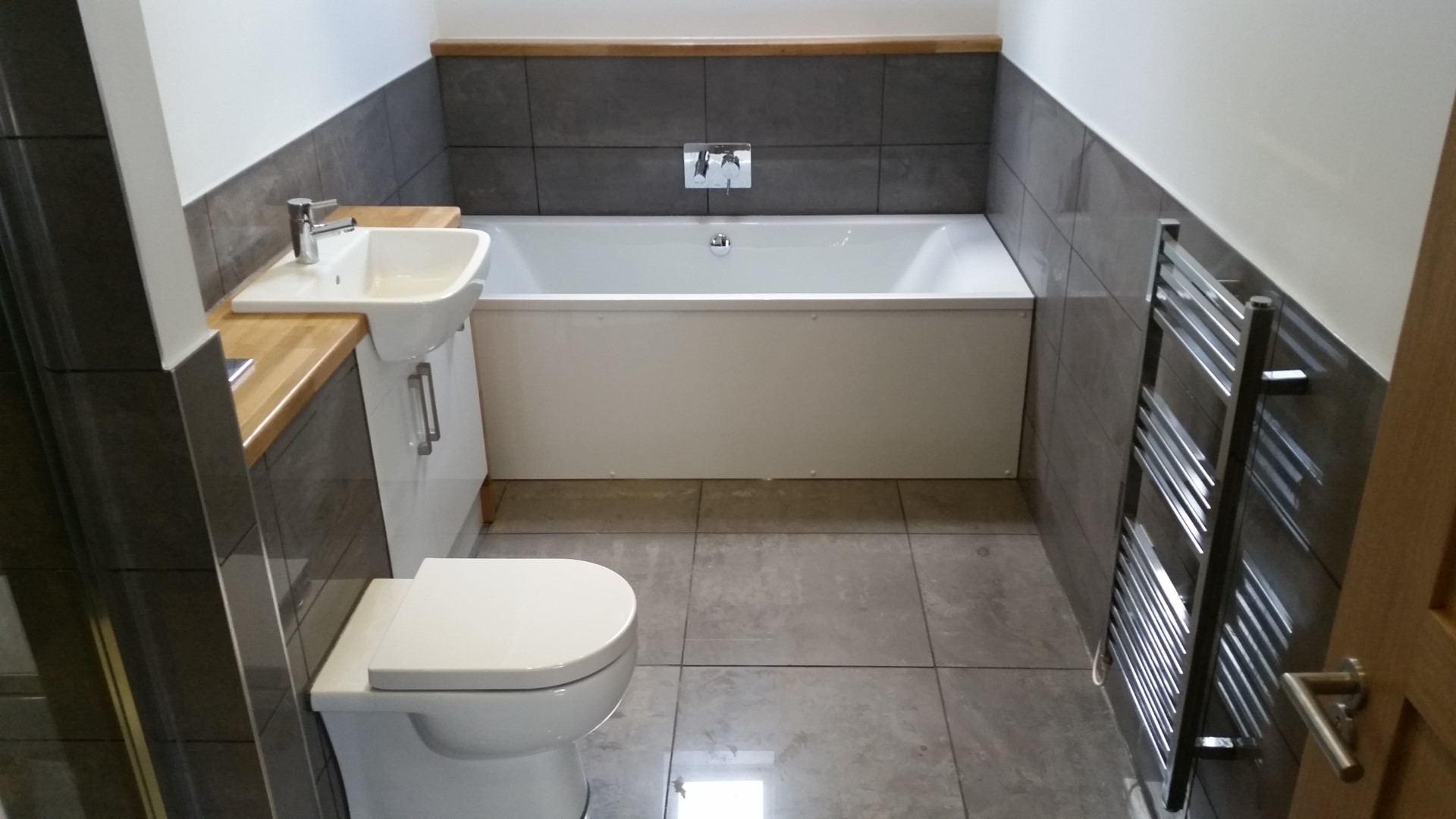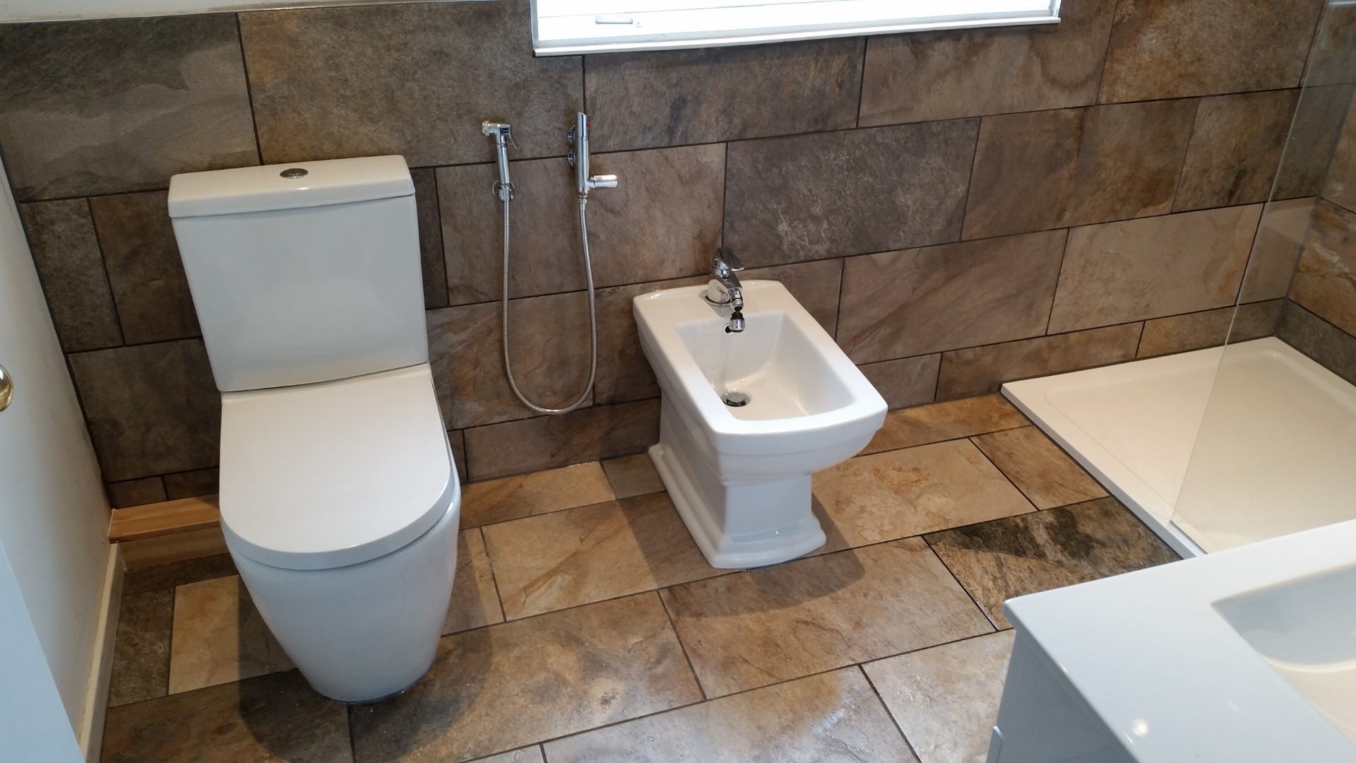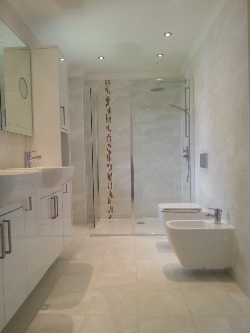 Shower room design and build with wall hung W.C. and bidet