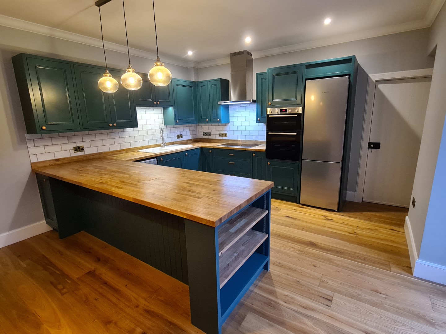 Bespoke hand made and finished kitchen with solid oak worktops and brushed and oiled solid oak flooring