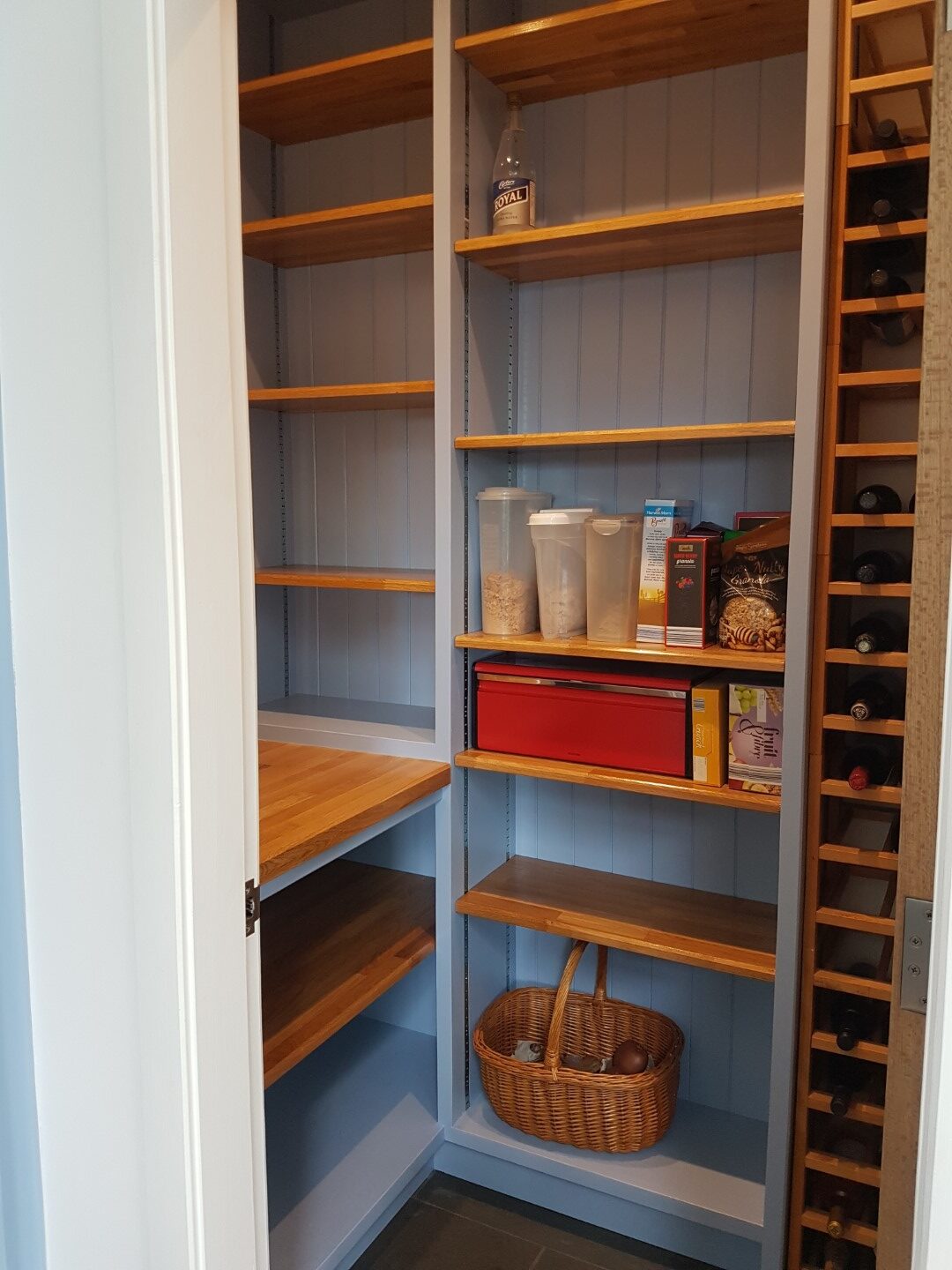 Bespoke hand made and finished larder with solid oak worktops, adjustable shelving and wine rack