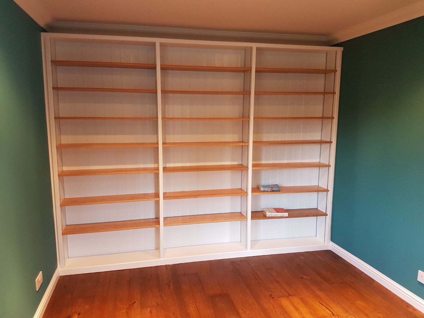 Bespoke hand painted bookcase with adjustable solid oak shelving