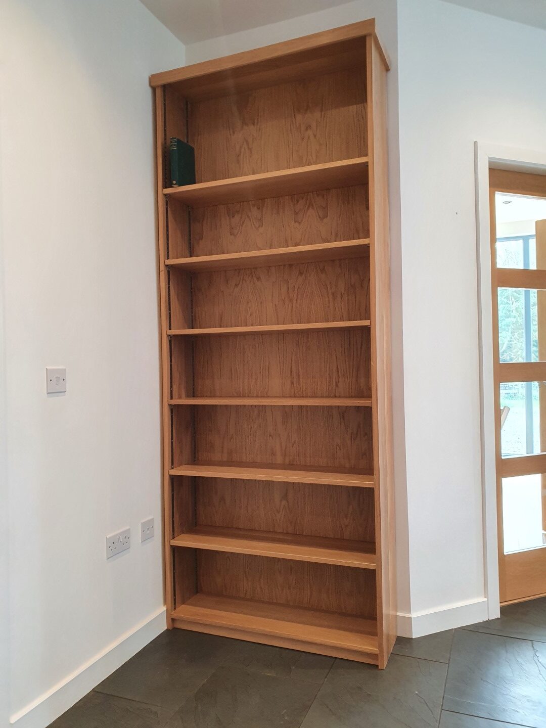 Bespoke solid oak bookcase with adjustable shelving and clear lacquer finish