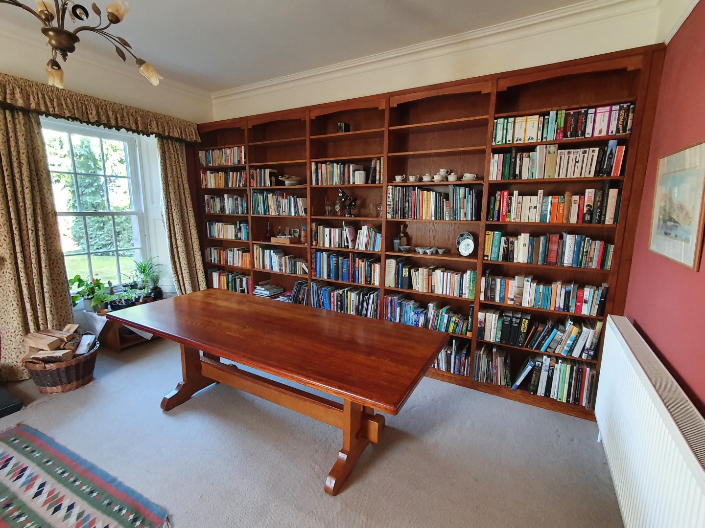 Bespoke solid oak refectory table stained to match bookcase