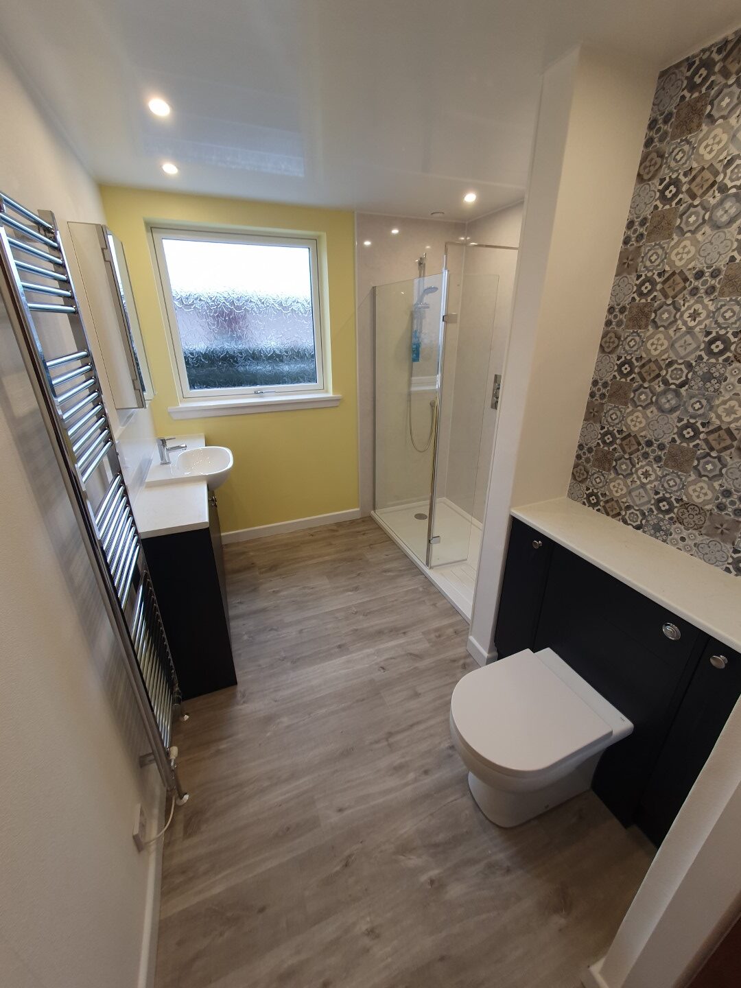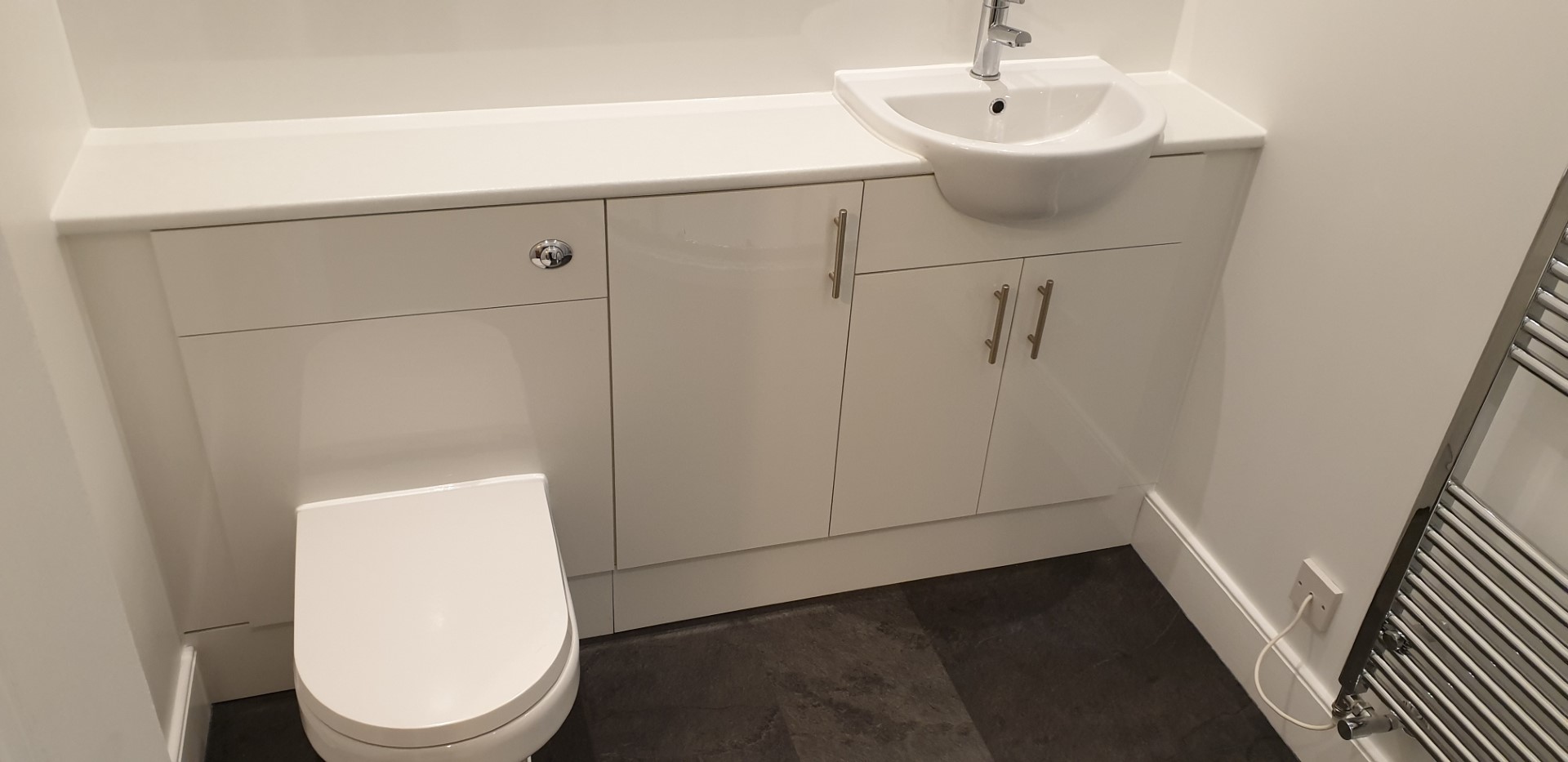 Contemporary shower room with fitted vanity and W.C. cupboards